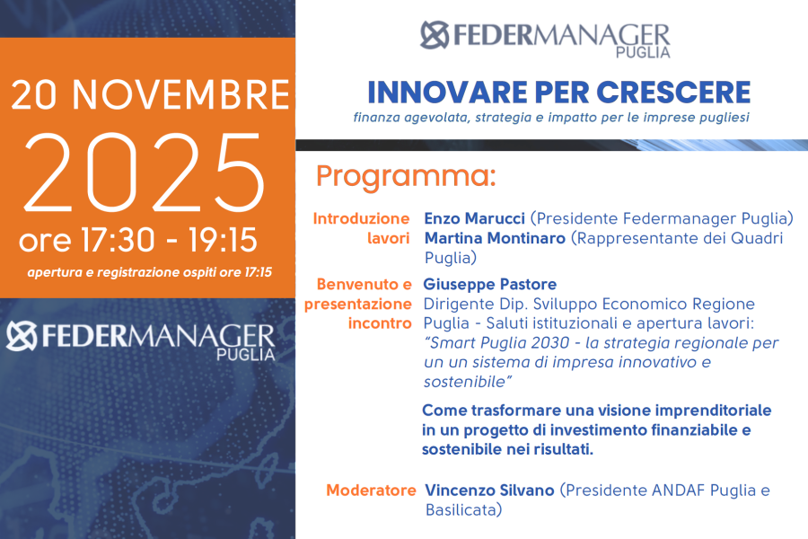 Federmanager Puglia è lieta di invitare tutti i soci e le socie a partecipare all’importante appuntamento dedicato alla parità di genere e alla sostenibilità nel Sud Italia, dal titolo “La centralità delle donne nel lavoro e nella governance: percorsi di parità e sostenibilità nel Sud Italia”. 📅 Data: 26 novembre 2025 🕔 Ora: 17:00 📍…