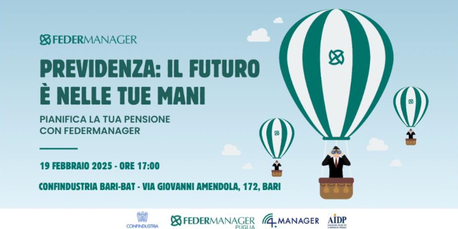 Abbiamo il piacere di pubblicare una sintesi molto interessante degli interventi del 19 febbraio 2025, presso la sede Confindustria Bari Bat, dove si è tenuto il convegno Federmanager “Progetto Previdenza: un porto sicuro per i manager”. L’incontro, introdotto dal presidente Federmanager Puglia Enzo Marucci, ha visto la partecipazione di Mario Cardoni (Direttore Generale FM), Giulio Cristiano (Direttore Provinciale INPS Bari), Gianfranco Minervini (Presidente AIDP Puglia) e Rita Comandini (Consulente Previdenziale FM).